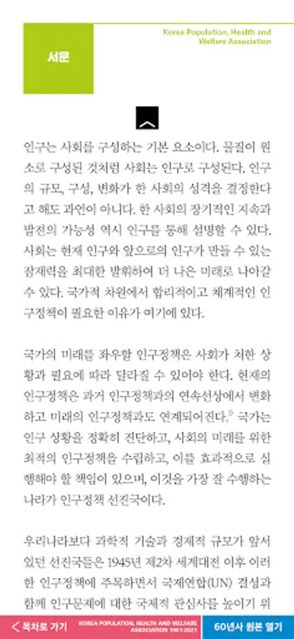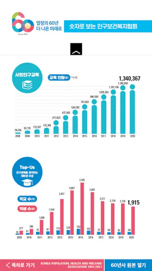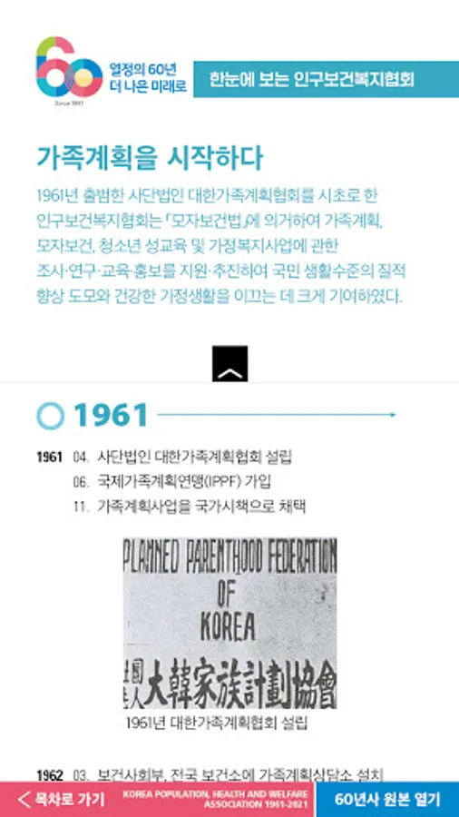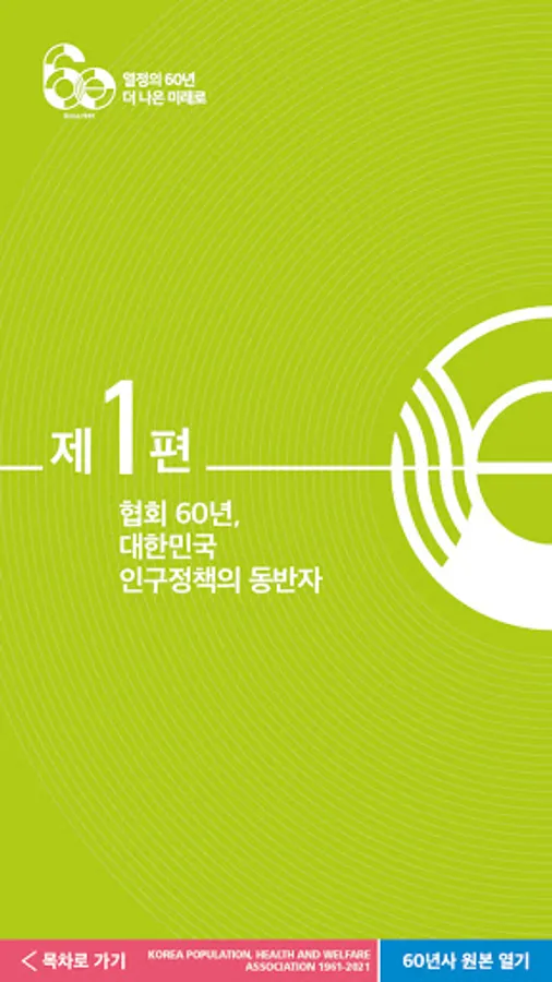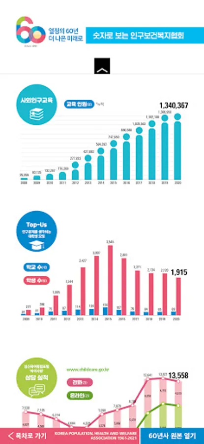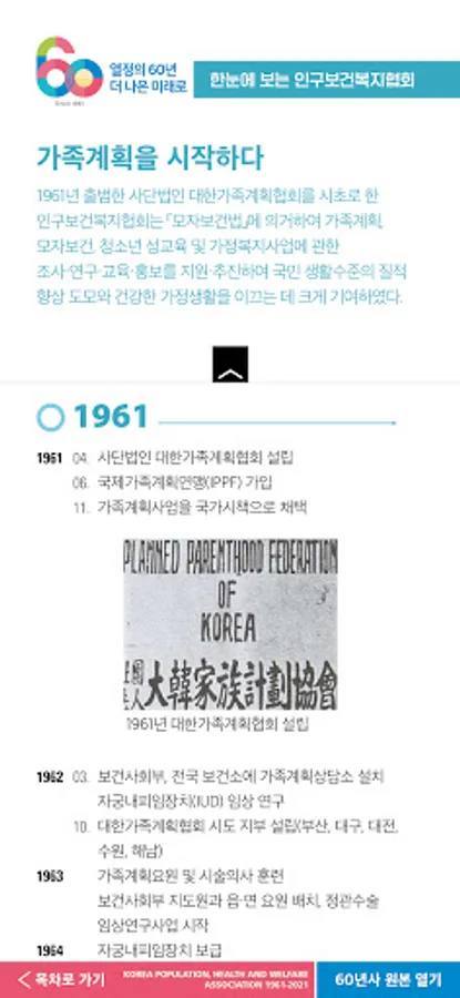 The Population Health and Welfare Association was established on April 1, 1961, and this year marks its 60th anniversary. The 60-year history of the Population Health and Welfare Association is a mobile information service that summarizes the association's 60-year history and achievements, and consists of 13 municipal and provincial offices, major projects, and interviews. For more information about the Population Health and Welfare Association, please visit the website (www.ppfk.or.kr).
