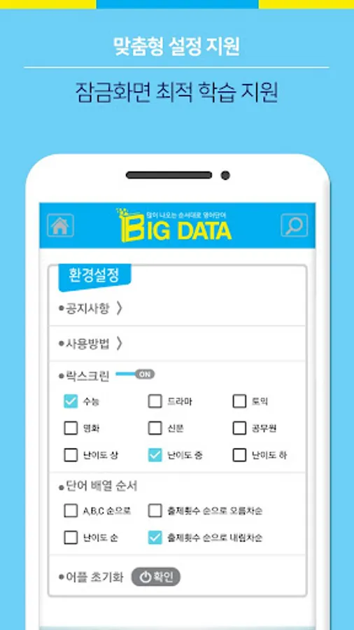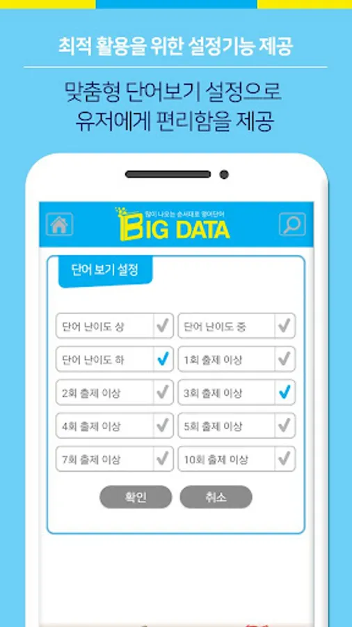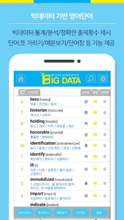 기능을 제공하며, 설정을 통해 자기 맞춤형 영어단어를 보실 수 있습니다.