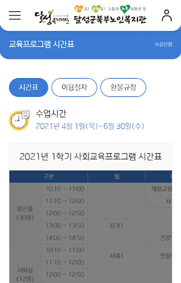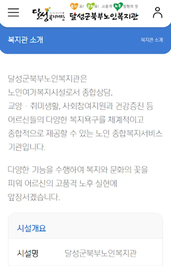 Dalseong-gun Northern Senior Welfare Center is a comprehensive welfare service for the elderly that can systematically and comprehensively provide the various welfare needs of the elderly such as comprehensive counseling, liberal arts/hobby life, social participation support and health promotion. We will take the lead in realizing high-quality retirement for the elderly by performing various functions to bloom welfare and culture.