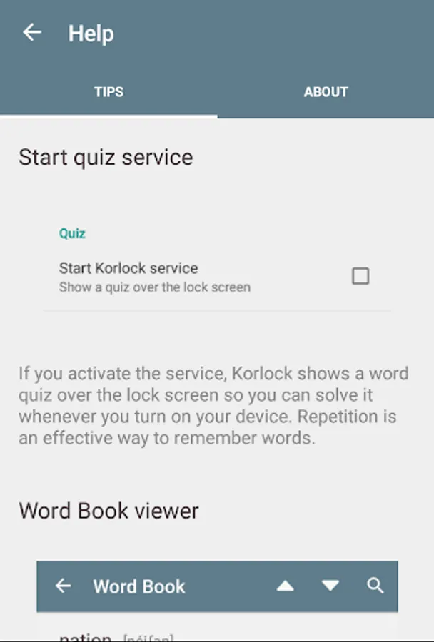 1. Korean-English word quiz: Korlock shows word quiz over your lock screen. Remember Korean words solving the quiz!