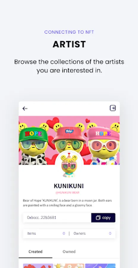 누구나 쉽게 NFT를 생성, 구매, 판매할 수 있으며, 크리에이터가 생성한 NFT는 블록체인 기반의 디지털 콘텐츠가 됩니다.
