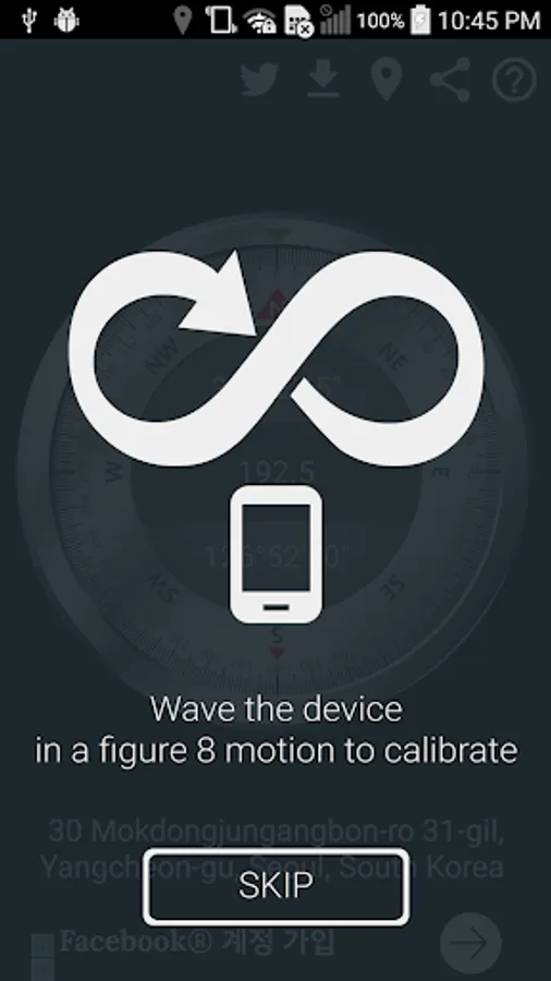 ※ If the compass pointing direction of application is error, Please move the device in a figure 8 pattern & rotate around all axes.