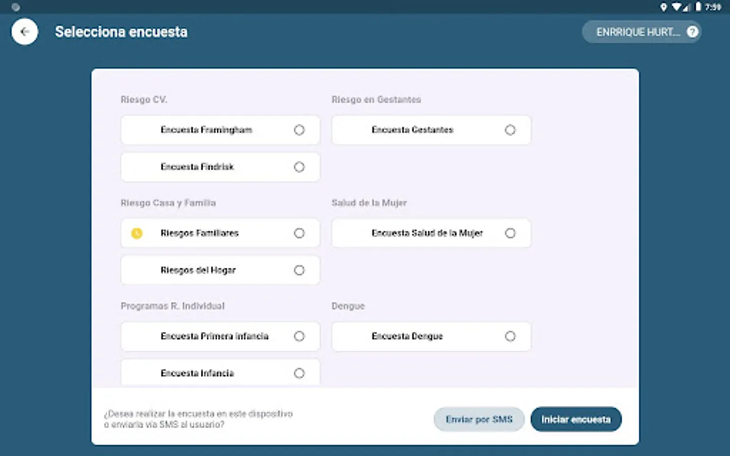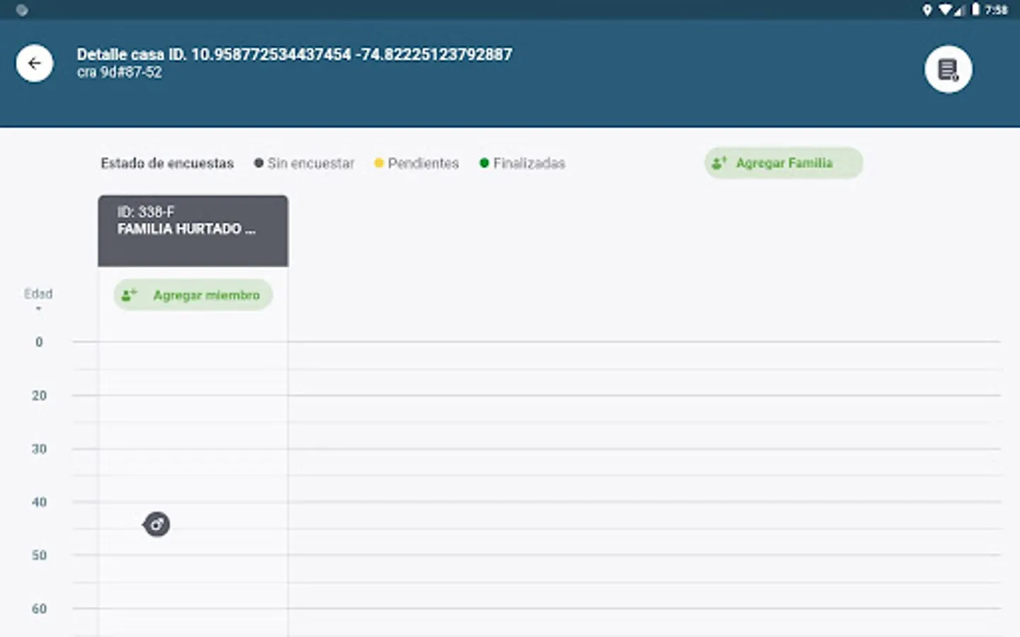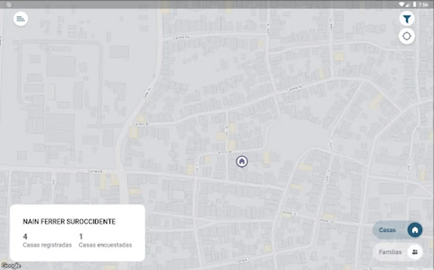 Mobile application with geolocation, for the intervention of homes, families and individuals through the completion of surveys which will help identify the different risks. This application allows you to locate yourself interactively in a zone of the map or in a certain area, it allows you to mark houses to later fill out surveys related to housing, family and each of its members.