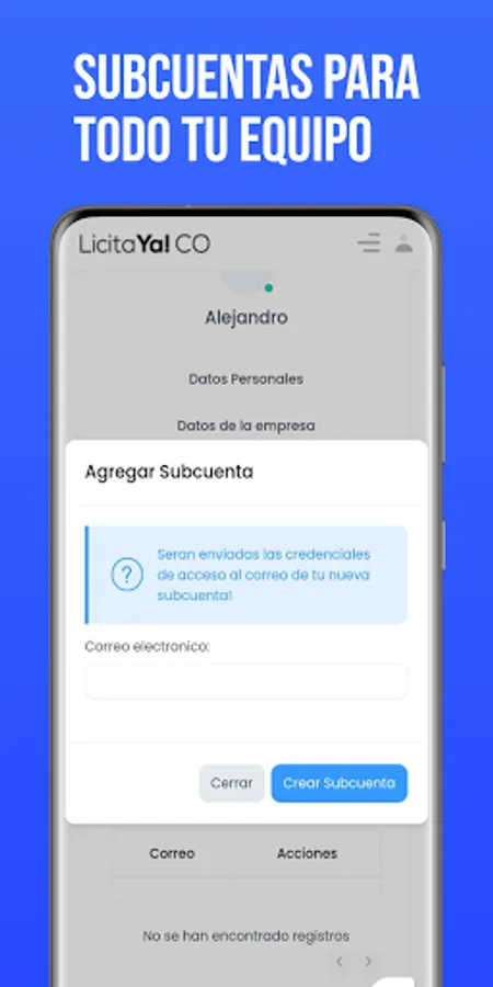 With LicitaYa! You have no limit in alerts or in the tenders you can review. Each plan, including the free one, gives you the possibility to create 3, 8 or 12 subaccounts. We love teamwork.