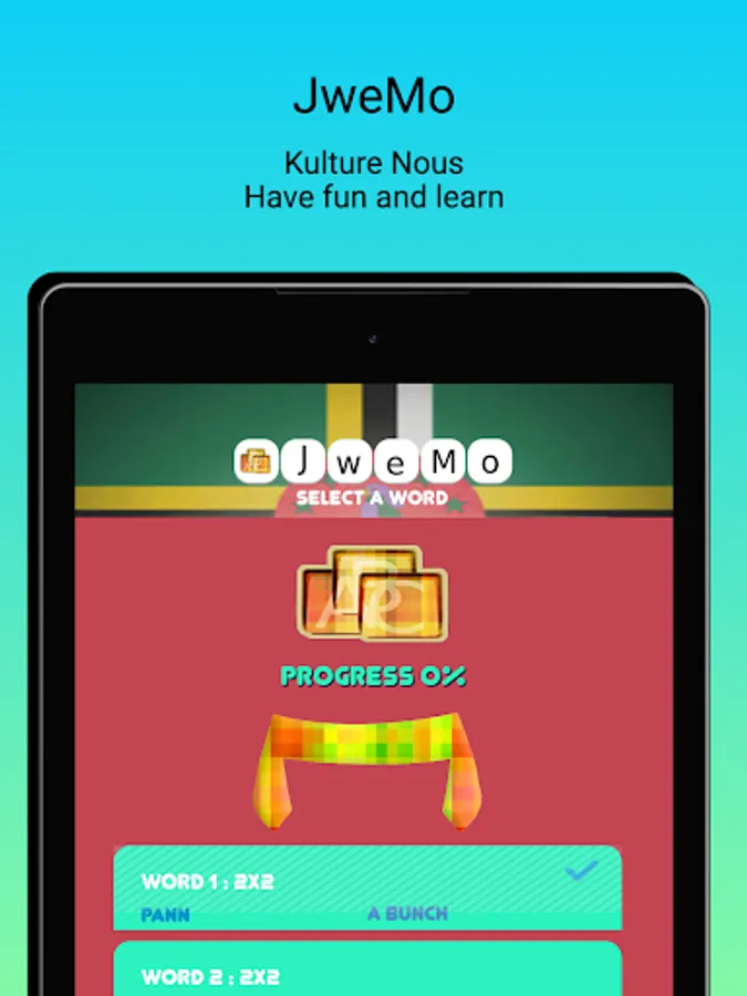 A simple adaptation of a classic word game. This time you get to guess creole words and see their meanings. Drums sound when you guess correctly.