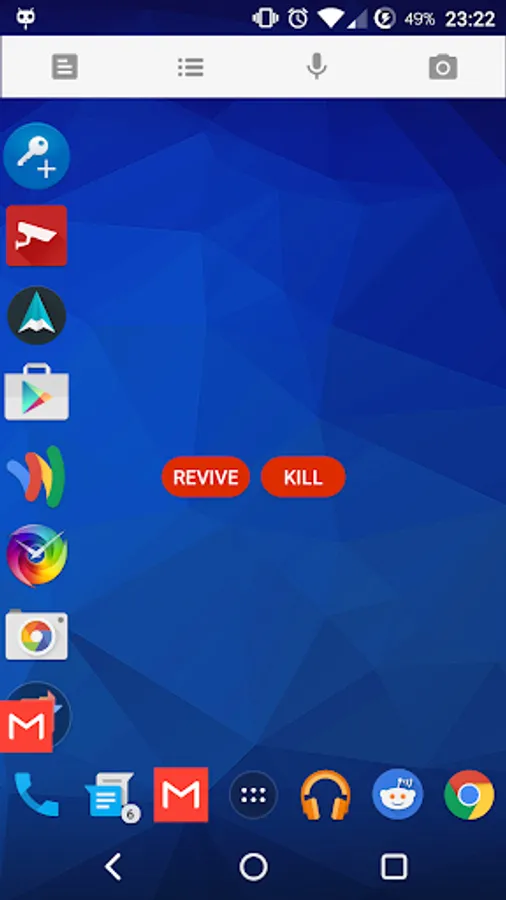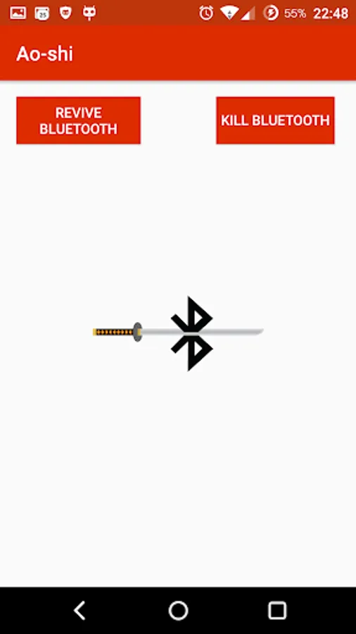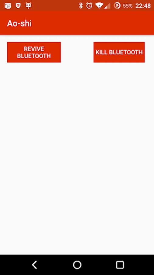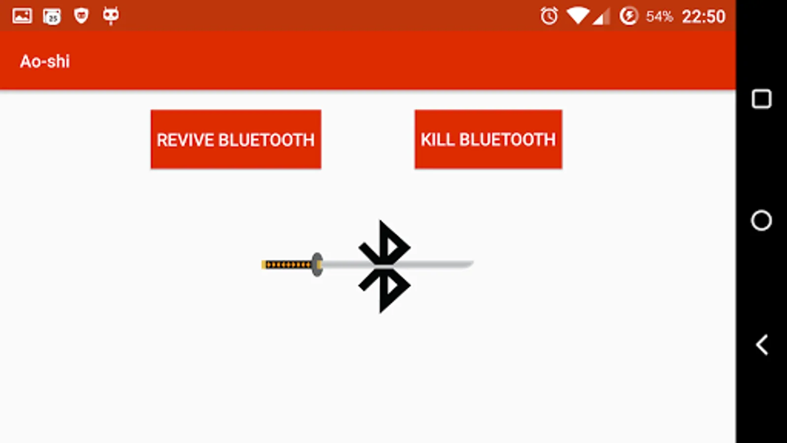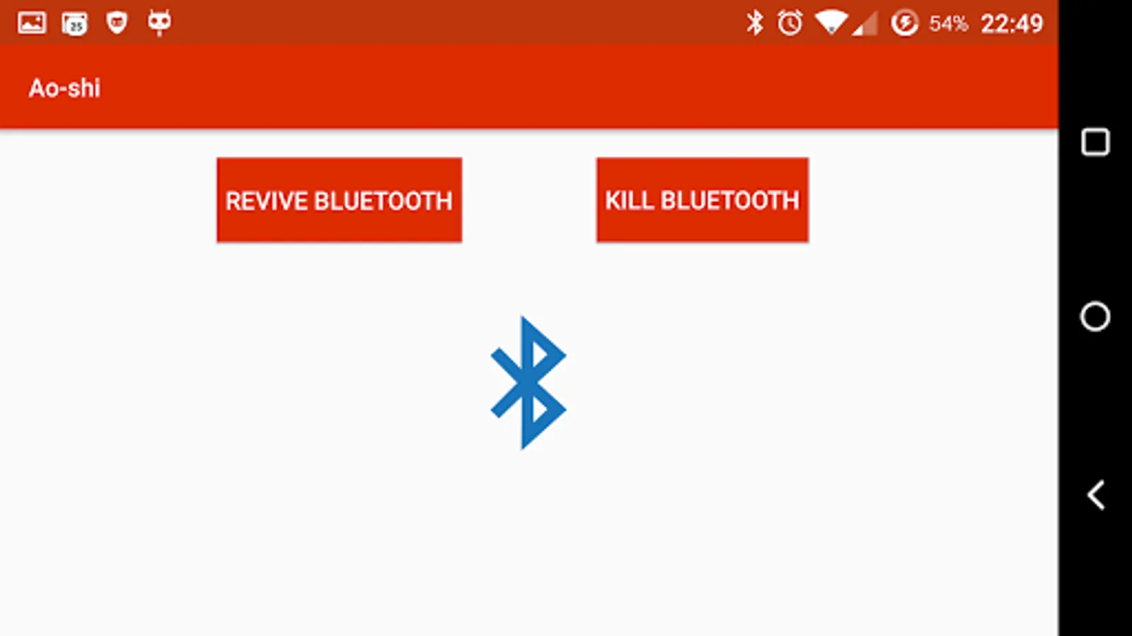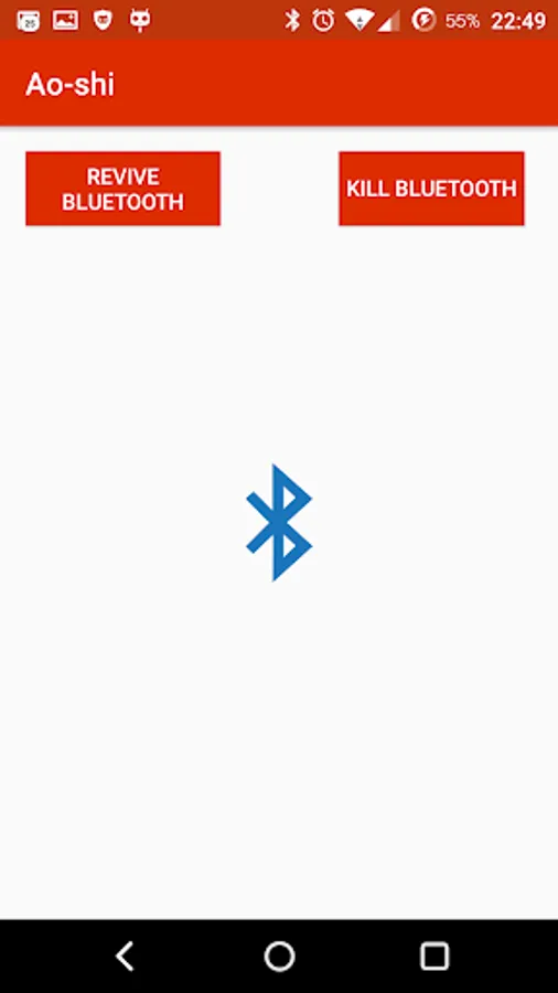 Application overwhelms the user with two options. One button (using root permissions) kills the bluetooth service in any state, allowing it to be started again. The other button allows the user to start the bluetooth service after it is killed.
