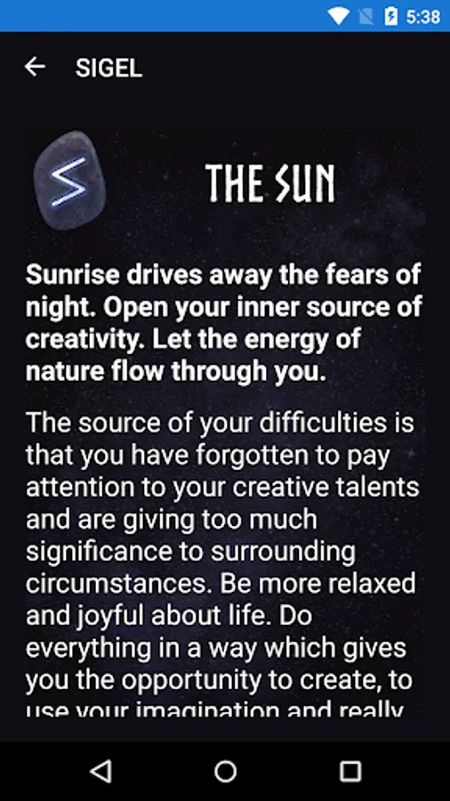 "These unique runic interpretations reflect a depth of knowledge of this ancient divination system. Each rune is masterfully written and clearly communicated with powerful descriptions that allow the essence of the runes to be learned with ease. Working with this specific app is my morning ritual and a favorite way to start the day. I often use it for a quick guide to the day or when I'm searching for a specific answer to a question. The potential for the different layouts and the ability to read the meanings separately makes this app a must have for those into these sacred oracle stones."