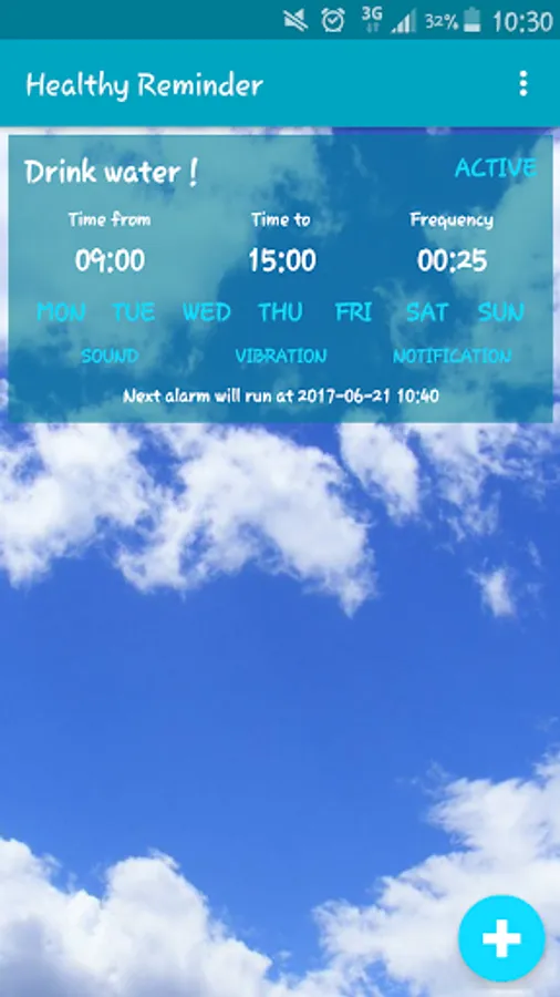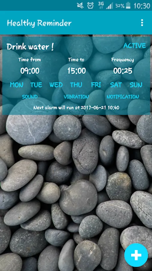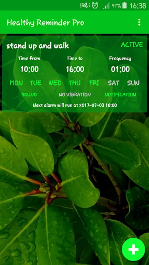 It allows to schedule reminders for workdays/weekend between to set up hours with the given frequency.