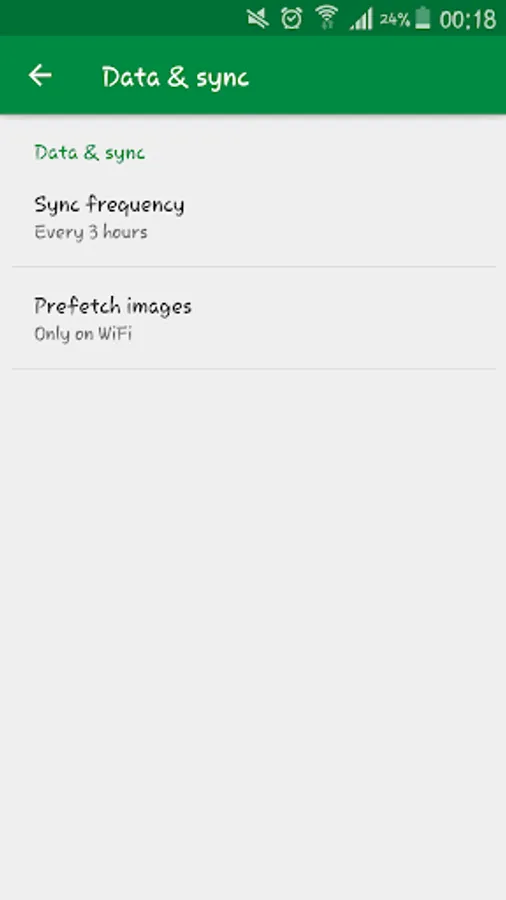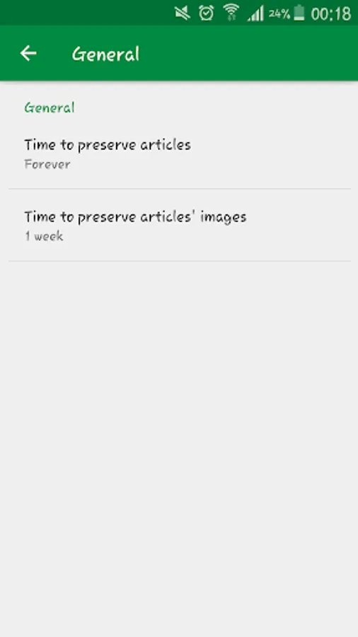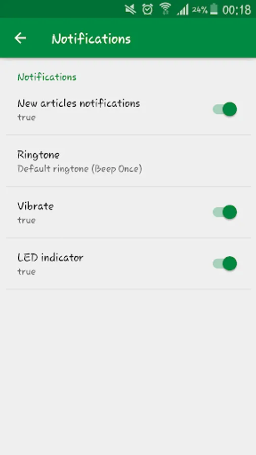 - available application settings: time to preserve articles on the phone, frequency of news' checking, showing notifications, possibility to choose the notification sound and vibration