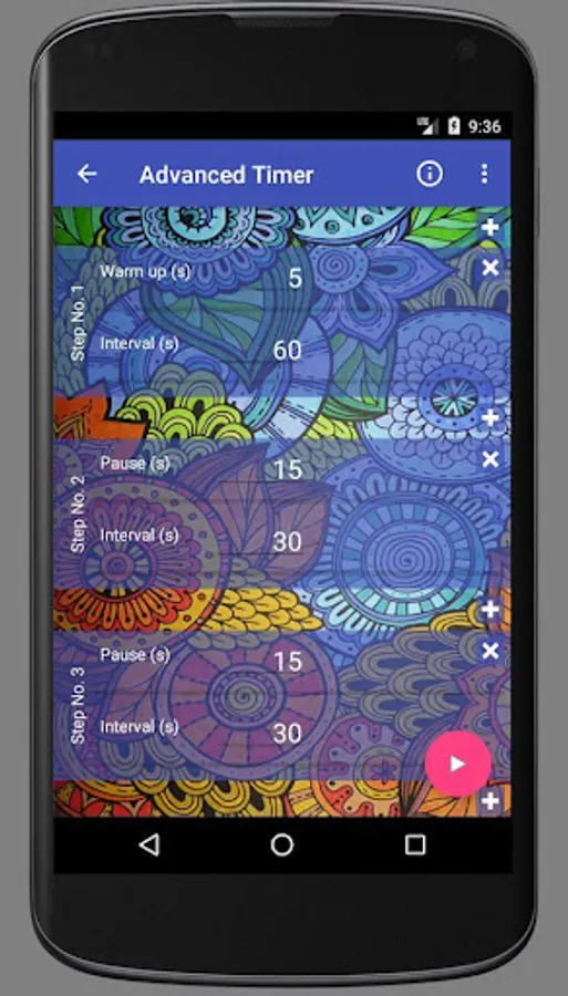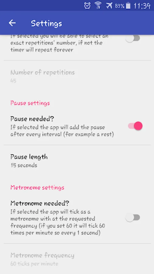 - add breaks between the intervals if you want! you can choose a pause from 3 seconds to 30 minutes. So it's perfect for an interval training (for example 5 minutes activity -> 30s break -> 5 minutes -> 30s -> etc...