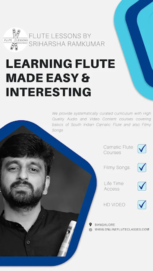 FLUTE LESSONS BY SRIHARSHA RAMKUMAR APP is for you if you want to learn the 'Carnatic Music Heritage' through this divine instrument 'The South Indian Carnatic Flute' in the easiest way!