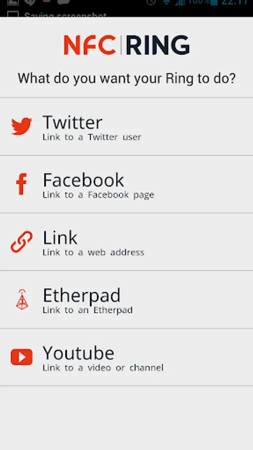 The NFC Ring® app has built in support for Facebook, Twitter, generic website links, Etherpad and Youtube.