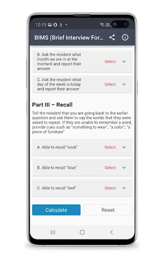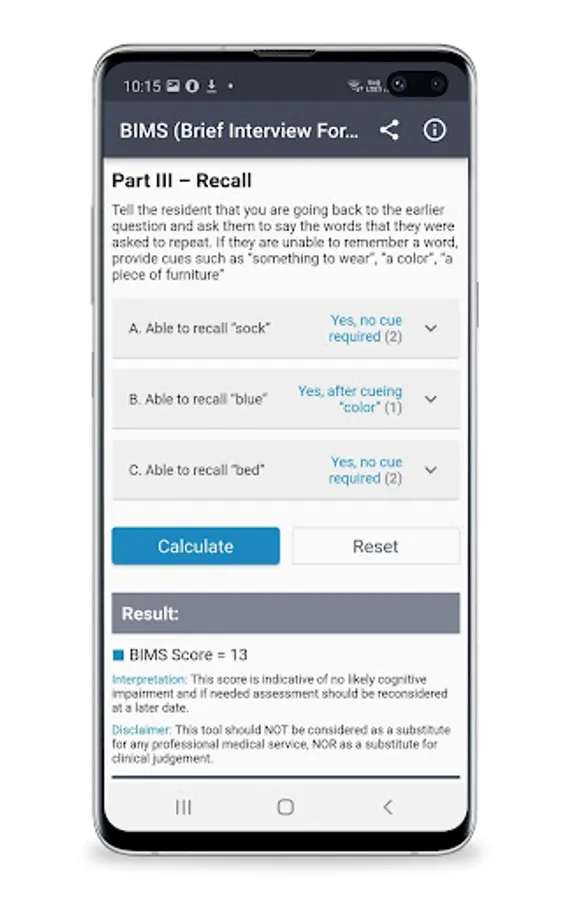This Brief Interview For Mental Status (BIMS Score) calculator evaluates cognitive impairment and can help with dementia diagnosis.