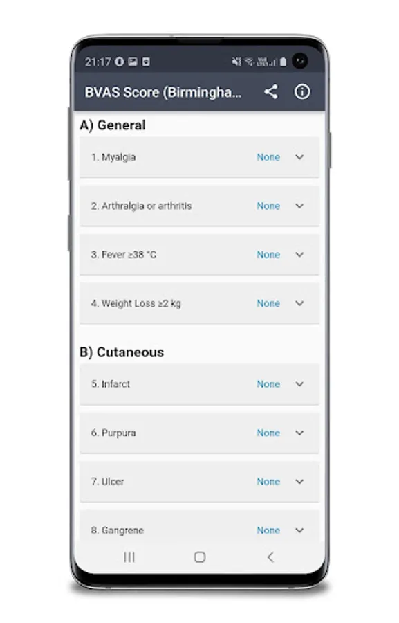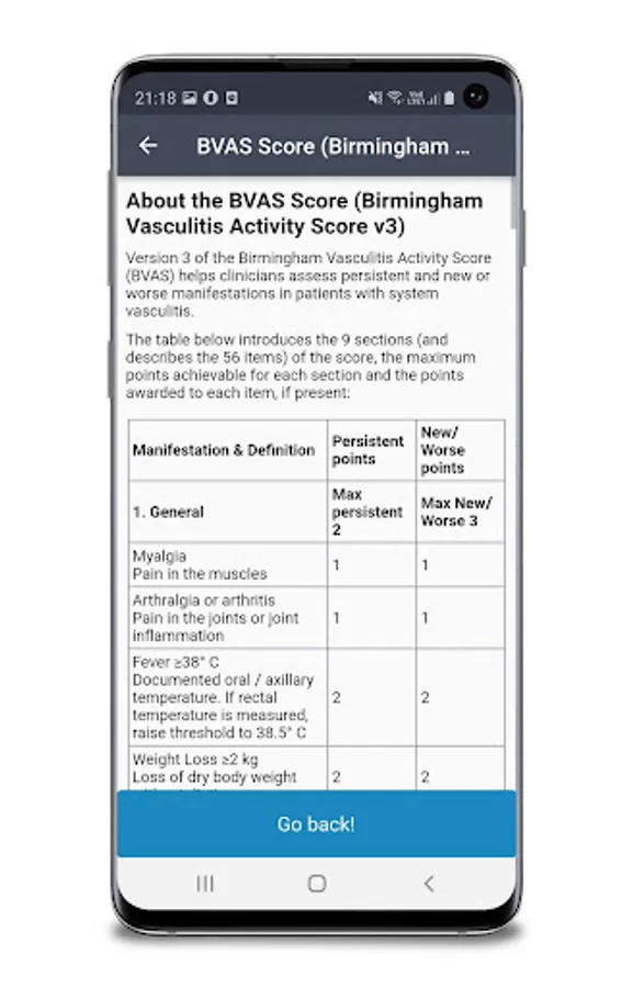 Birmingham Vasculitis Activity Score (BVAS) v3 assesses symptoms and signs of systemic vasculitis, both persistent and new or worsening ones. It consists of 9 sections, each with several items that need to be rated, if present.