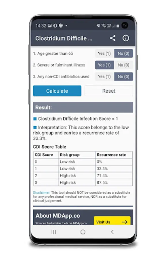 Clostridium Difficile Infection Score stratifies the rate of Clostridium Difficile Infection (CDI) recurrence with patient age, severity of the disease and antibiotic use.