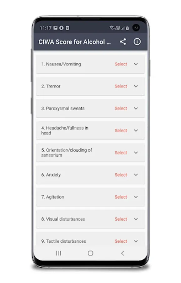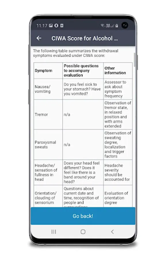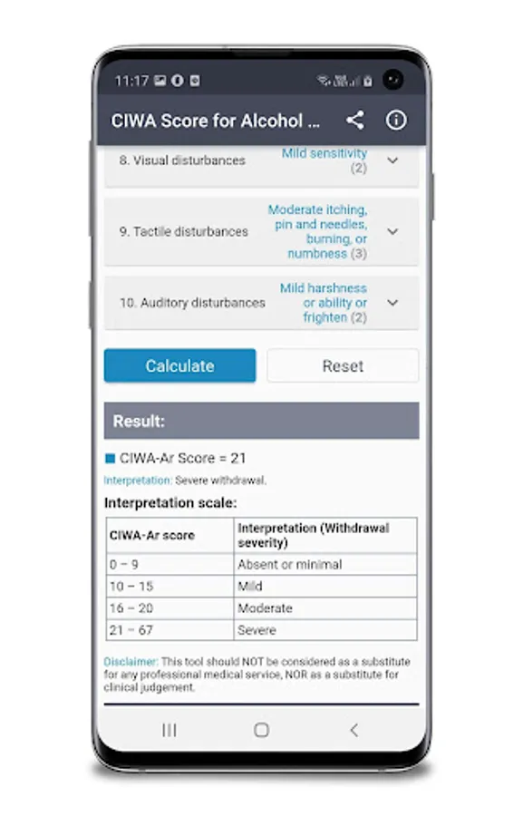 Each of the 10 items in the CIWA-Ar weight between 0 and 7 points, depending on the severity of the experienced symptoms. The table below summarizes the CIWA-Ar scores and their interpretation: