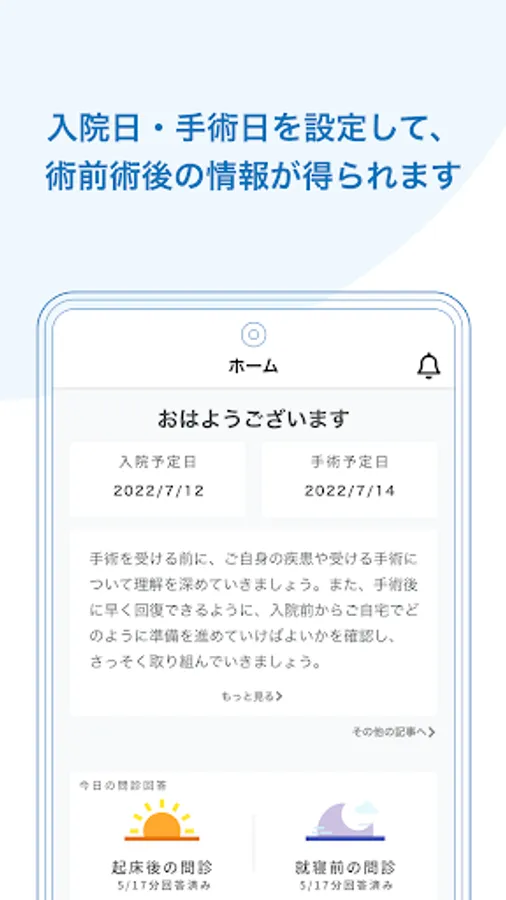 The app contains information on how to prepare for hospitalization and how to spend time after discharge, so you can understand surgery and life after discharge at your own pace.