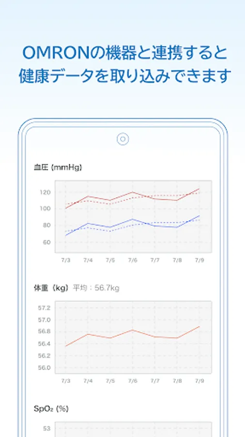 It is possible to transfer recorded data such as blood pressure, weight, and activity while displaying it in graph format.