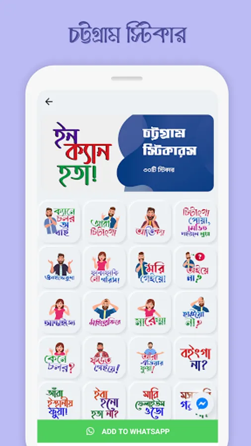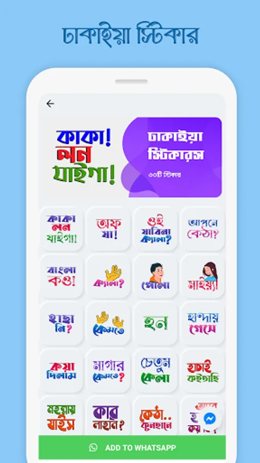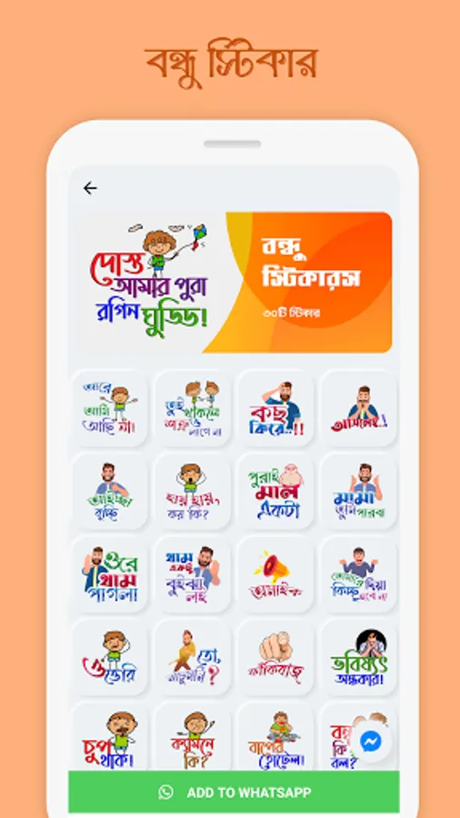 mSticker app for WhatsApp to communicate with your friends & loved ones with more than 500+ high quality BANGLA stickers. Make your conversation more funny and exiting by sharing a huge number of BANGLA dialogues, viral & trendy words, funny memes, & the regional language dialogues (Dhakaiya, Borishailla, Noakhailla, Chatgaiya and many more) sticker on WhatsApp.