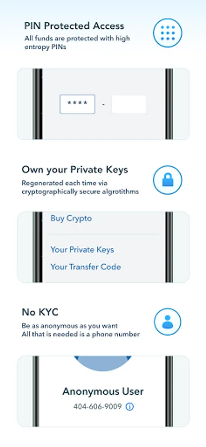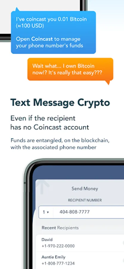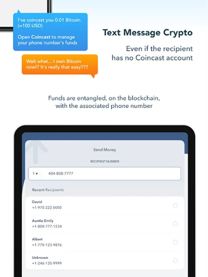 Sending crypto is as simple as sending a text message. You simply text the crypto to a specific phone number and Coincast does the rest. The funds will be stored in an intermediary wallet with high-entropy access via a withdraw code which gets texted to your recipient. This code can be used at any time in the future by them to access the intermediary wallet and withdraw the funds. They do not need a Coincast account to receive funds. They can, at a future date, create a Coincast wallet and withdraw the funds into their wallet.