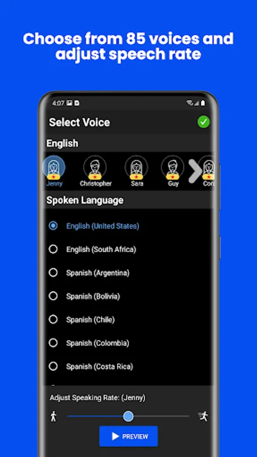 You can choose from over 85 voices spanning 8 different languages. Switch between male and female voices, and explore using popular accents like British and Australian.