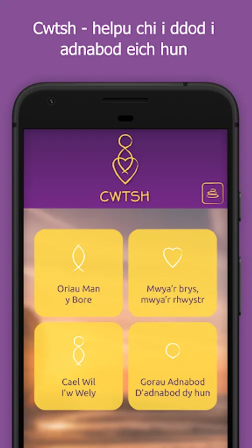 Cyflwyno dulliau sy’n hybu iechyd a lles yw Ap Cwtsh, megis myfyrdodau cynhenid Cymreig. Mae Ap Cwtsh yn cynnwys sesiynau myfyrio newydd sbon sy’n adlewyrchu ein hiaith, ein hanes a’n diwylliant.