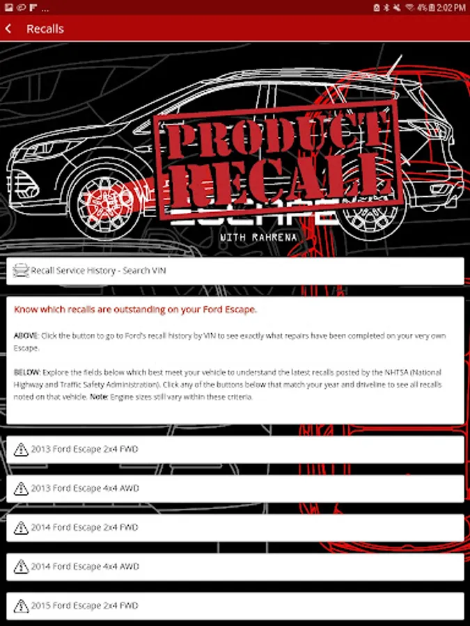- Safety recall lookups for all existing recalls for your model, or your specific vehicle
