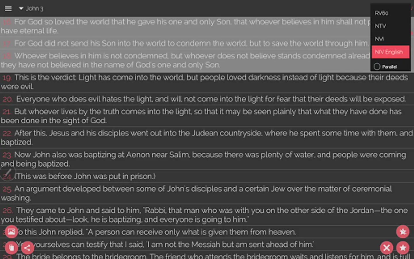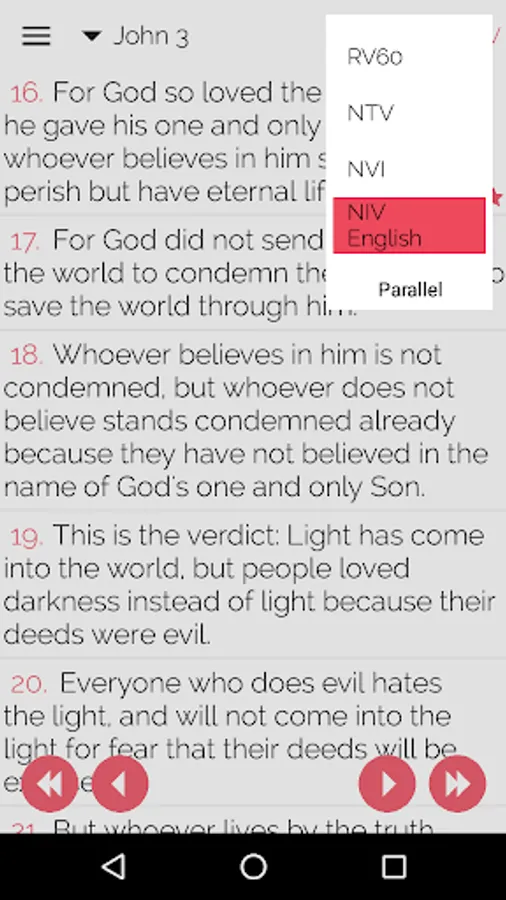 4 Versions of the Bible (NIV English, RV60, NTV, NVI) no adicional download.