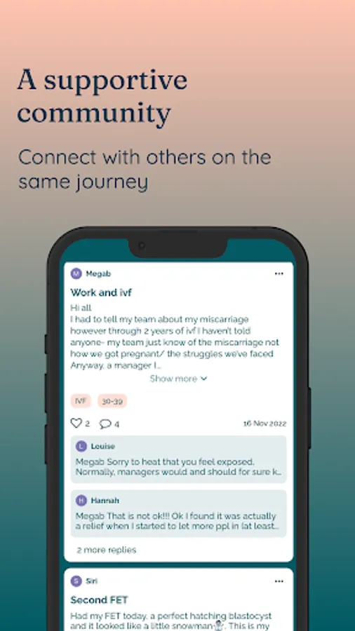 Connect with others in our community. Find others who are doing the same fertility treatment as you or just share your feelings with others who understand what you are going through.
