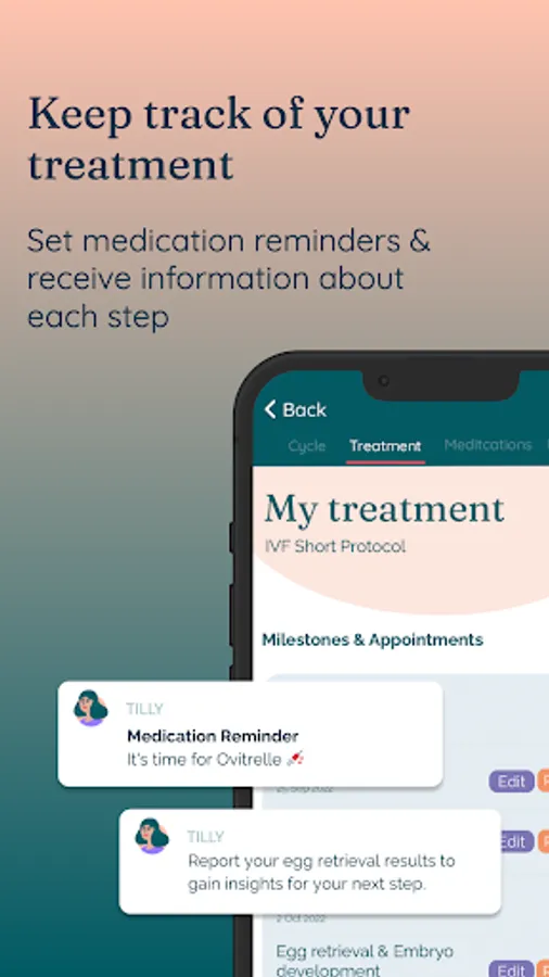 Never miss a medication or appointment. Tilly creates a personalized treatment schedule based on your specific fertility treatment and gives you reminders of any upcoming events.