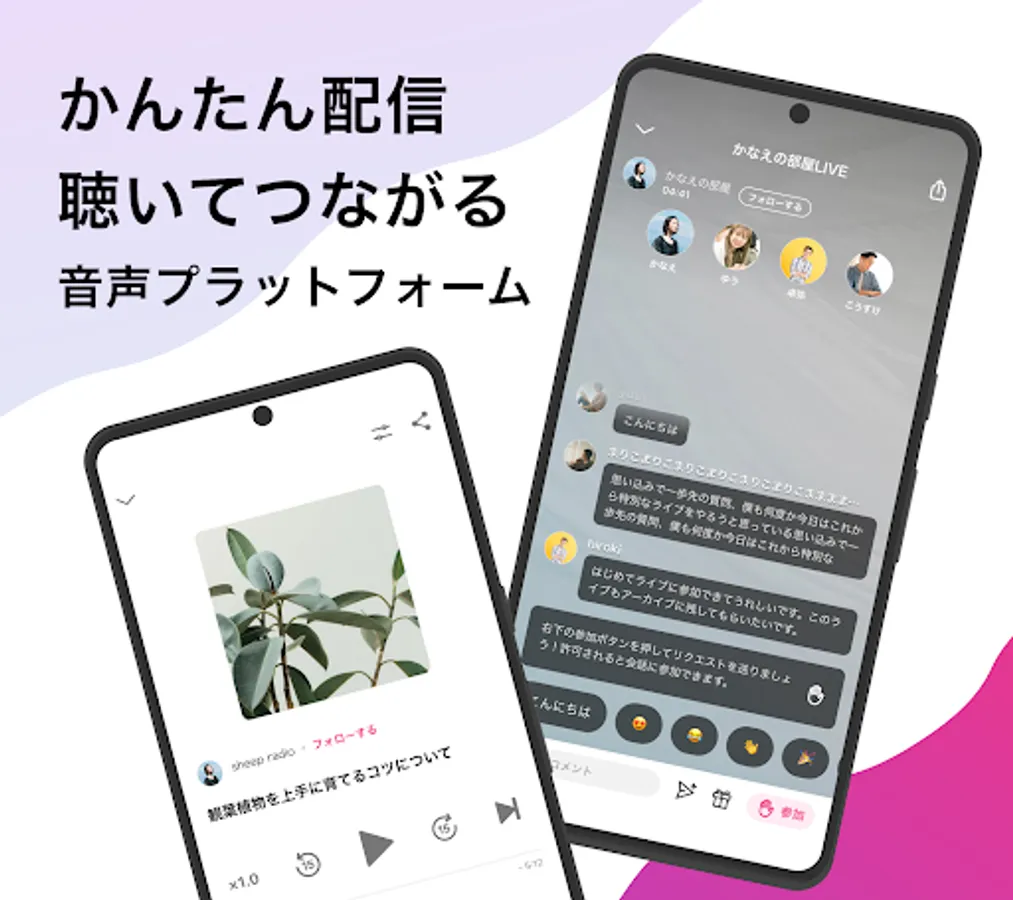 stand.fm is a "audio distribution platform app" that allows anyone to easily distribute audio with a single smartphone, wherever they are. You can enjoy both live distribution and recorded broadcasting.
