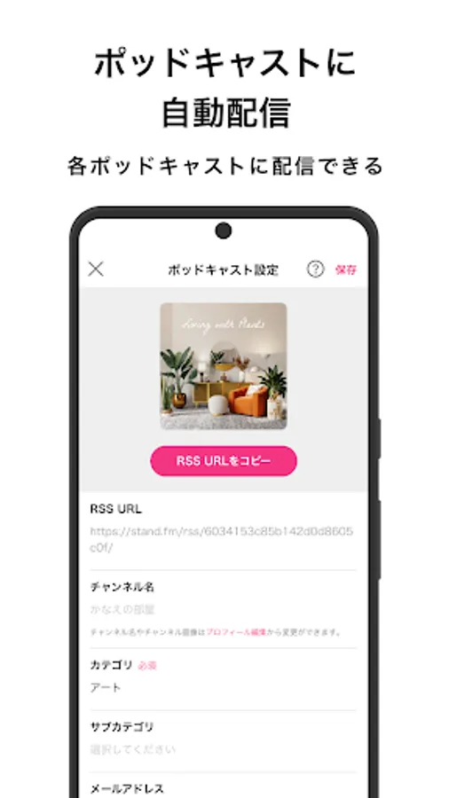Once you set up your podcast, the RSS URL of your channel will be issued immediately. By setting each service you want to distribute, you can also distribute podcasts from stand.fm to Apple Podcasts, Spotify, Google Podcasts, Amazon Music, etc.