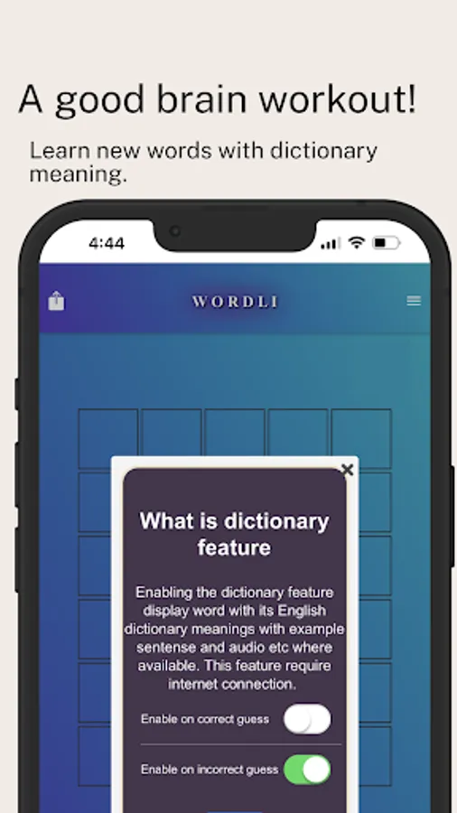 βExpand your knowledge with the Thesaurus feature, which allows you to explore dictionary meanings of the guess word. Dive deeper into each word's definition with sample sentences and even listen to word audio when available.