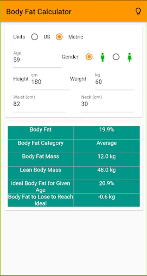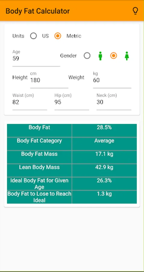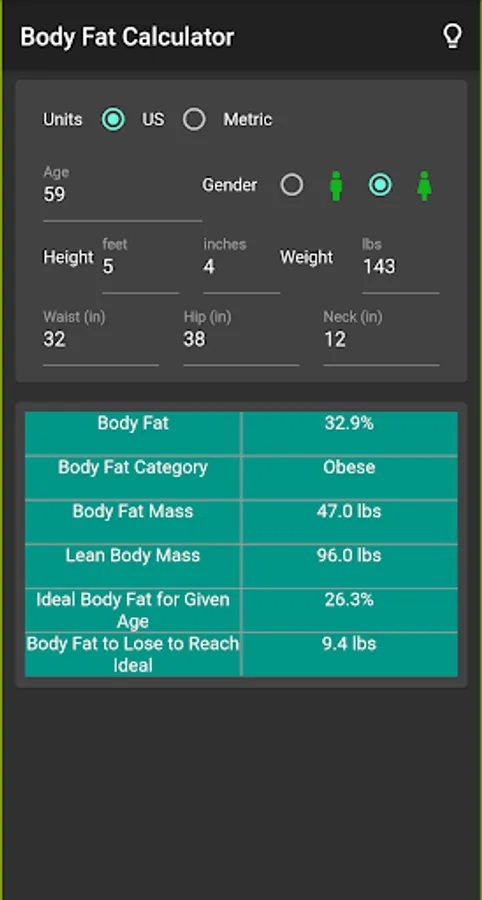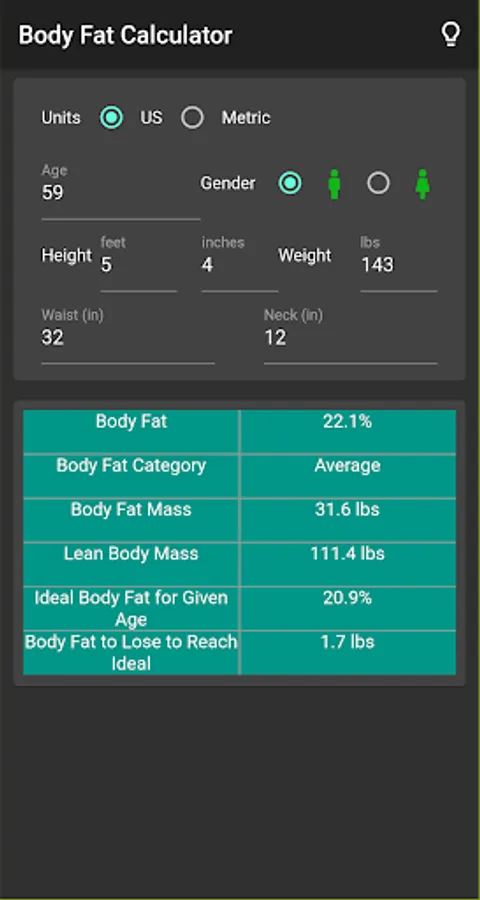 The Body Fat Calculator app uses the US Navy Method to provide an estimated percentage of your body weight that is the adipose tissue.