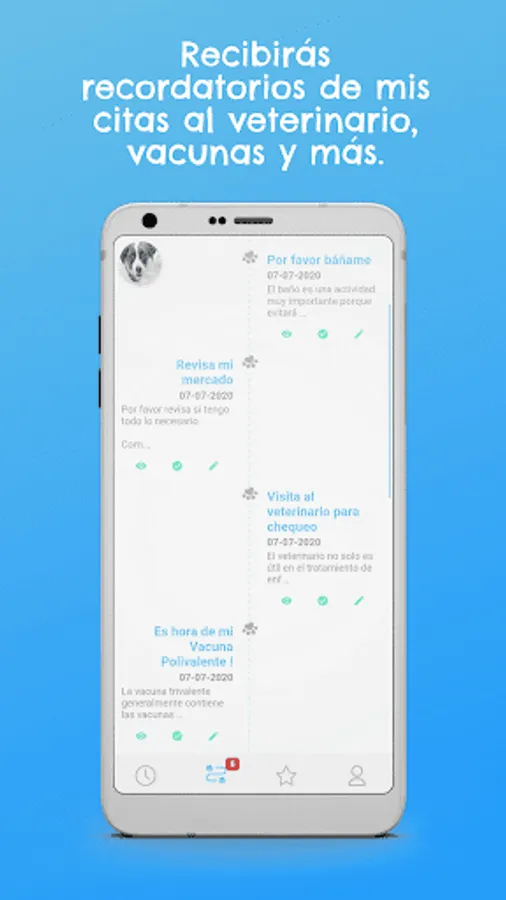 You will be able to take care of the well-being of your pet (dogs and cats) because we create daily routines of personalized care and reminders of vaccines, visits to the vet and important events, in order to take care of the mental, physical, social and emotional aspects of your pet in One place.