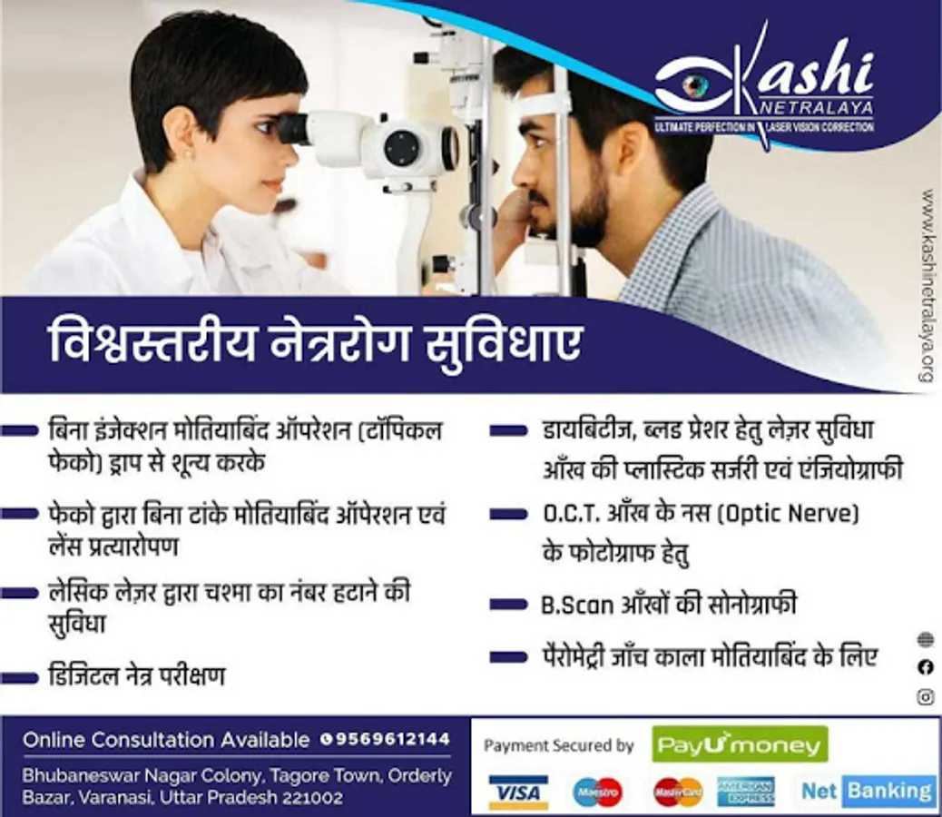 Kashi netralaya was established in 1992 with the state of the art eye care facilities in Trans Varuna area near circuit house in Bhubaneswar Nagar colony, orderly Bazar Varanasi. Our aim is to provide world-class ophthalmic care to the people of Poorvanchal with best eye care in all the subspecialties of ophthalmology at an affordable cost.We were pioneer in providing an intraocular lens implantation facility in Varanasi. Kashi netralaya was first to introduce Zepto robotic cataract surgery in Varanasi. We are 15 bedded daycare eye hospital with 3 OT, one Modular OT, one Lasik OT, and one extraocular OT. We have the fastest Ex 500 Wave lite Lasik laser machine for the last 6 years.