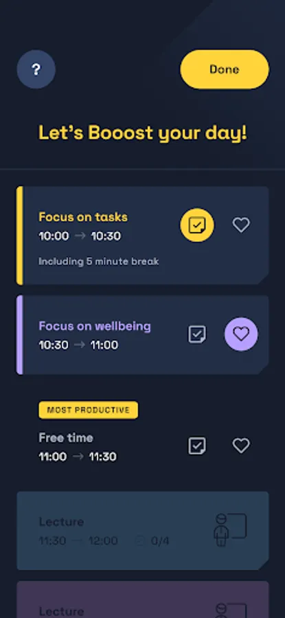 Booost helps students to plan and prioritise your tasks so you never miss a deadline or skip a class. And if things get tricky, it gives you access to expert study and wellbeing resources to help you get back on track.