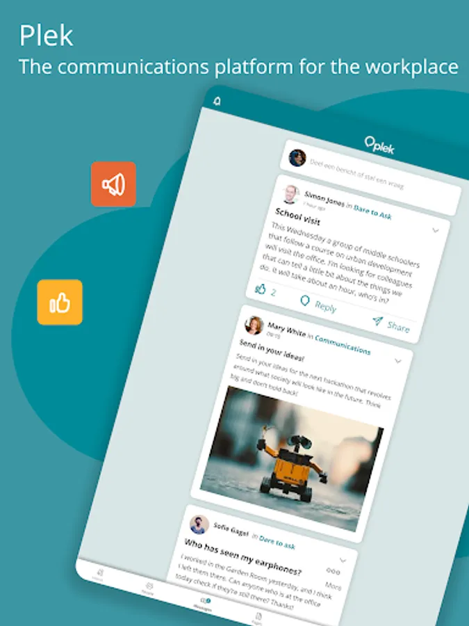 Plek is a community and collaboration platform: easy-to-use, fast, smart and secure. A social intranet, community portal and knowledge-sharing platform, with all essential functionalities: news, profiles, groups, messages, calendars, documents and messaging. Plek helps you break through silos, stimulating co-operation and knowledge sharing.
