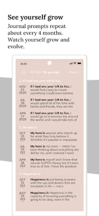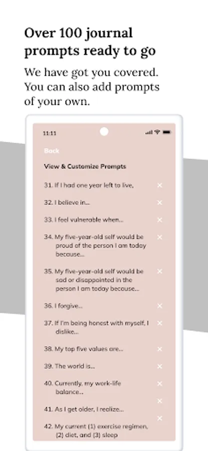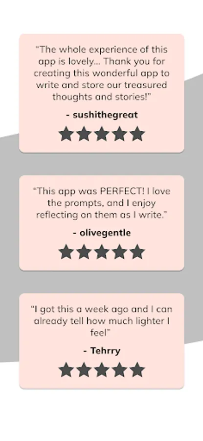 Our daily journal and diary app offers 190+ journal prompts to kick-start your writing and reflection journey. With daily reminders to ensure you stay on track, maintaining a consistent journal and diary habit has never been easier. Every journal and diary entry you make in this app is a step towards helping you combine reflection, introspection, and manifestation into a self care habit.