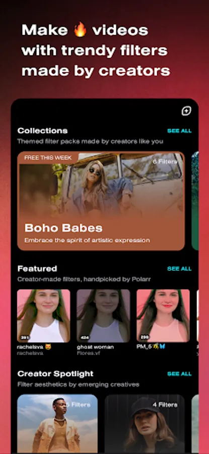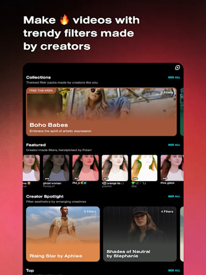 • Weekly updated Polarr filter collections and Creator Spotlights