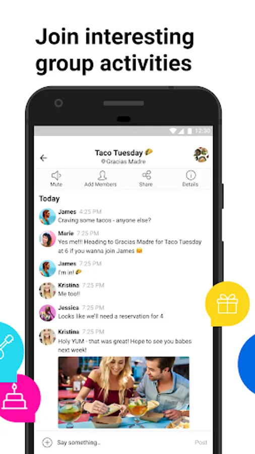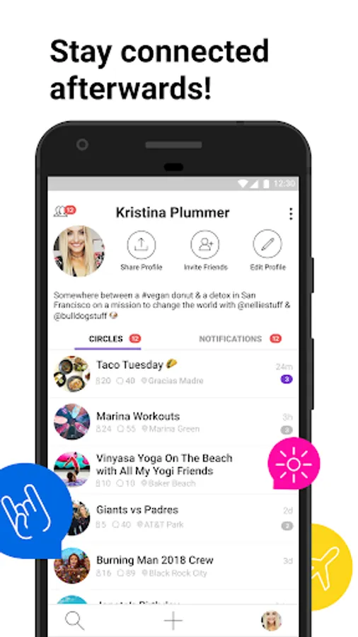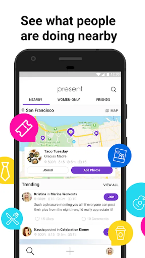 Present helps you find things to do with people nearby. Discover parties, sports, hobbies, events, and more. Join circles of local friends and neighbors who share your interests. Chat, share photos, and do more together.