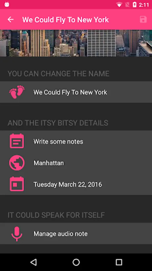 Footprints is your digital treasure box for your fondest memories. Store and relive your most precious moments with photos, audio notes, text notes and places.