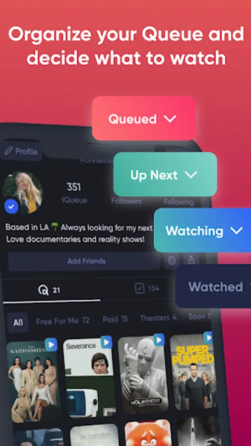 Keep in mind we aren't a streaming service - you still need to have access to streaming services in order to watch the movies and shows you discover on Queue.