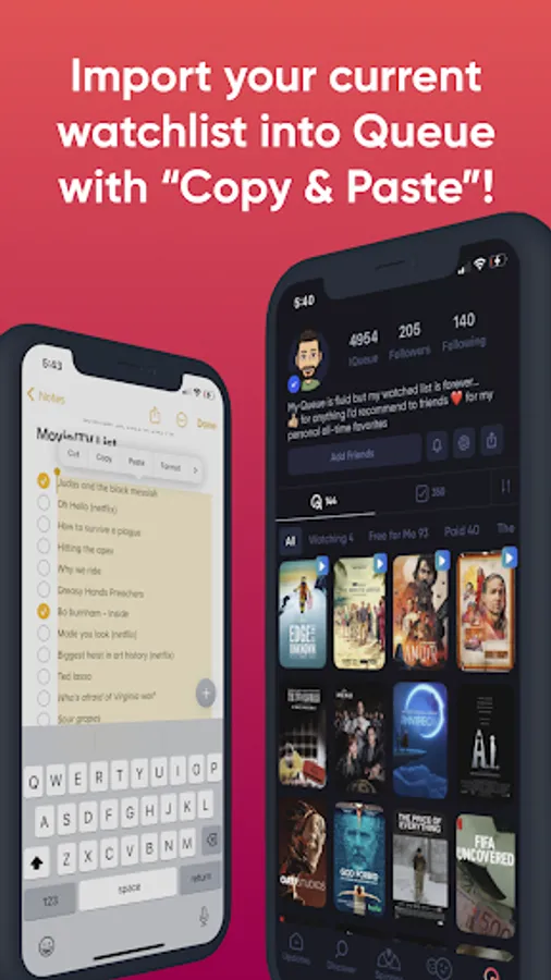 Deciding what to watch and where to stream it is brutal! Queue is the easiest way to track movies and shows across your streaming services and share recommendations with friends. On Queue you can look up any movie or show, see where it’s streaming, and start binging! For your TV shows, track your progress to see how many episodes and seasons you have left. You can also keep track of everything you’ve watched and everything your friends recommend. Now you can finally get rid of that unorganized list of what to watch you've been holding onto for years. Copy and Paste any list from your Notes, docs, or spreadsheets and in just a few seconds immediately add it to your Queue. We make answering the question “what should I watch tonight?” simple, easy, and fun.