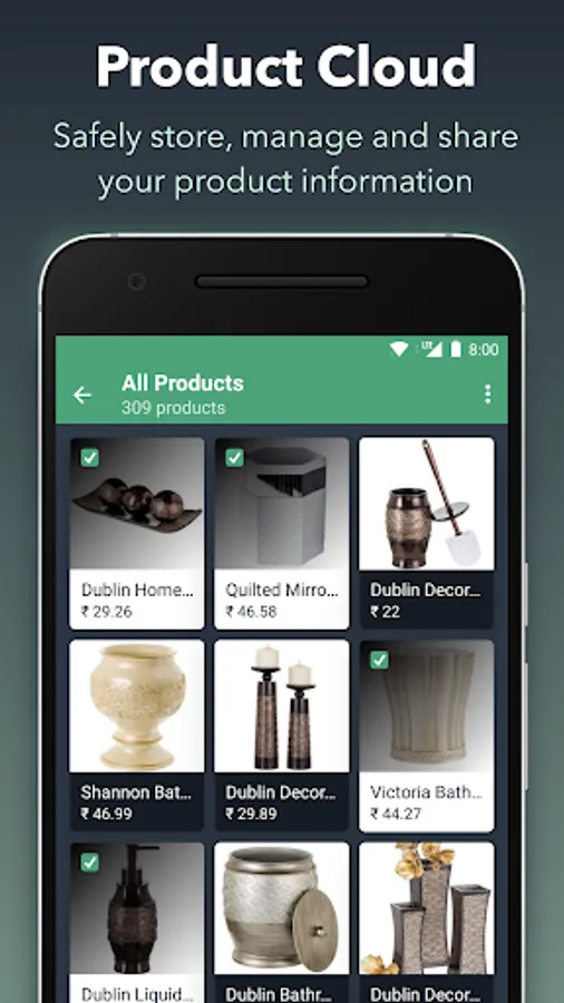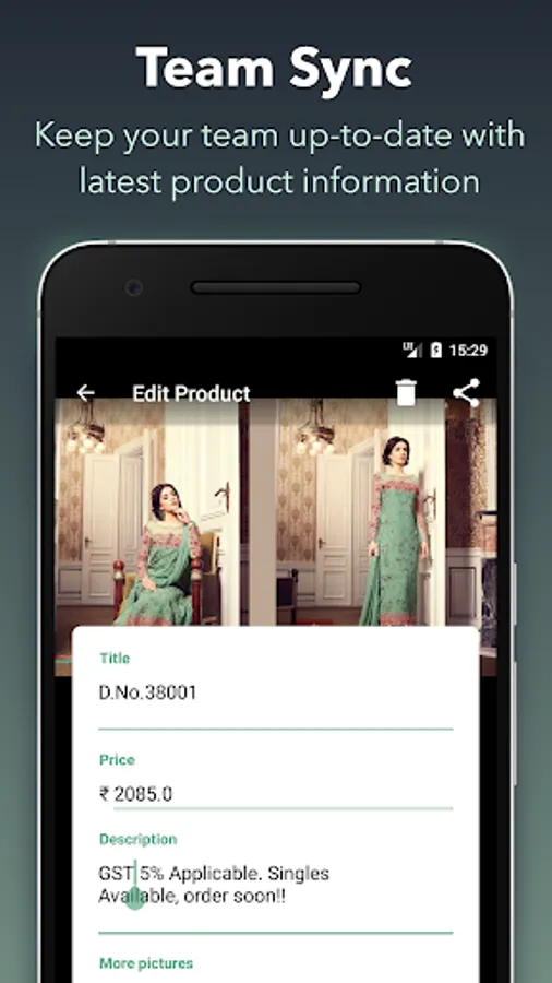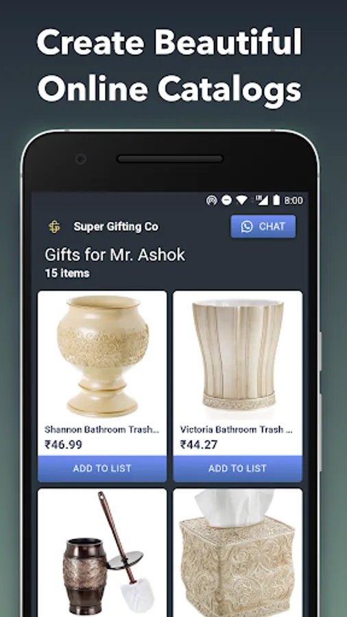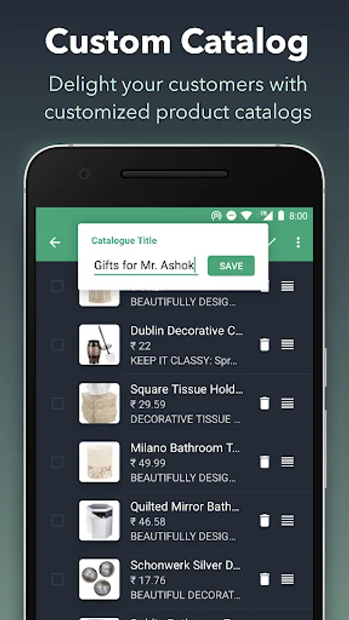 Just choose the products you want to share from your phone gallery, camera or existing products, give a nice title and your new catalogue is instantly ready. Go ahead and impress your buyers.