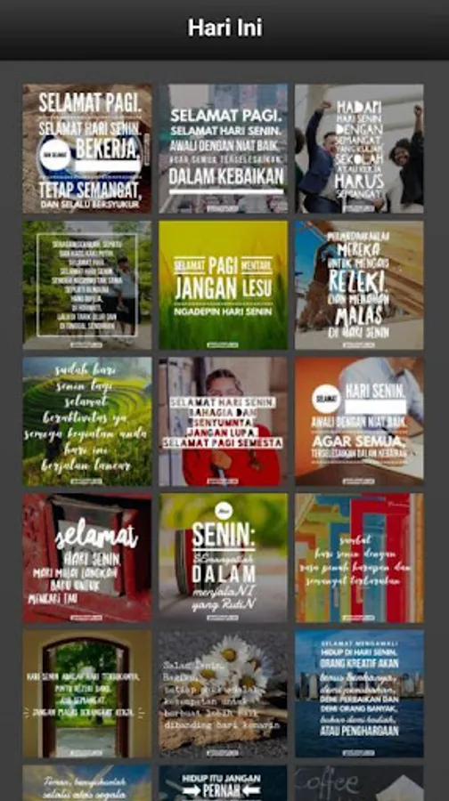 Aplikasi ini berisi kumpulan gambar kata ucapan Selamat Hari Senin, Selamat Hari Selasa, Selamat Hari Rabu, Selamat Hari Kamis, Selamat Hari Jumat, Selamat Hari Sabtu & Selamat Hari Minggu. Didesain dengan tipografi yang cantik dan elegan.