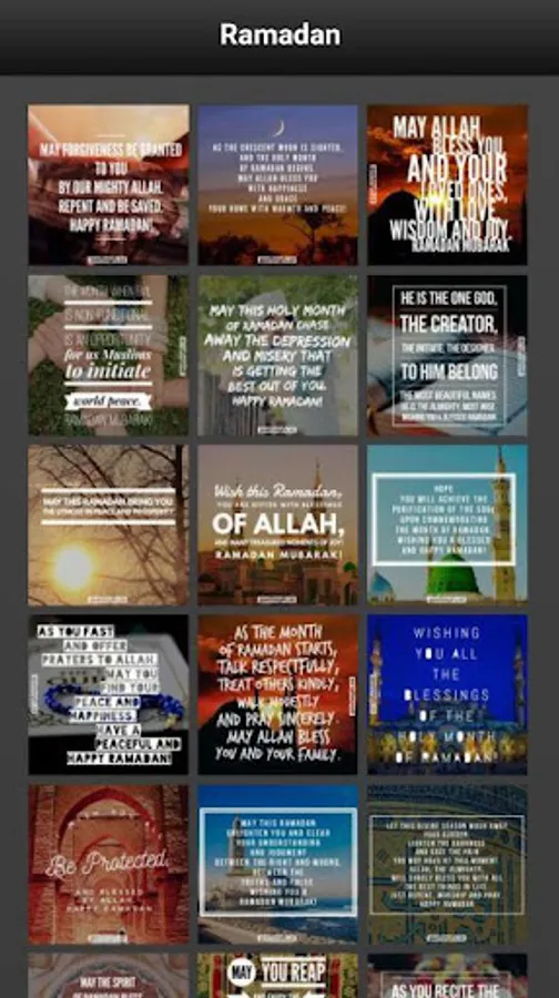 Ramadan Kareem Greeting Cards app features collection of Ramadan wishes with beautiful typography and images to greet your family and friends in the holy month.