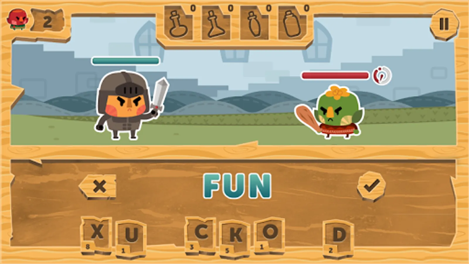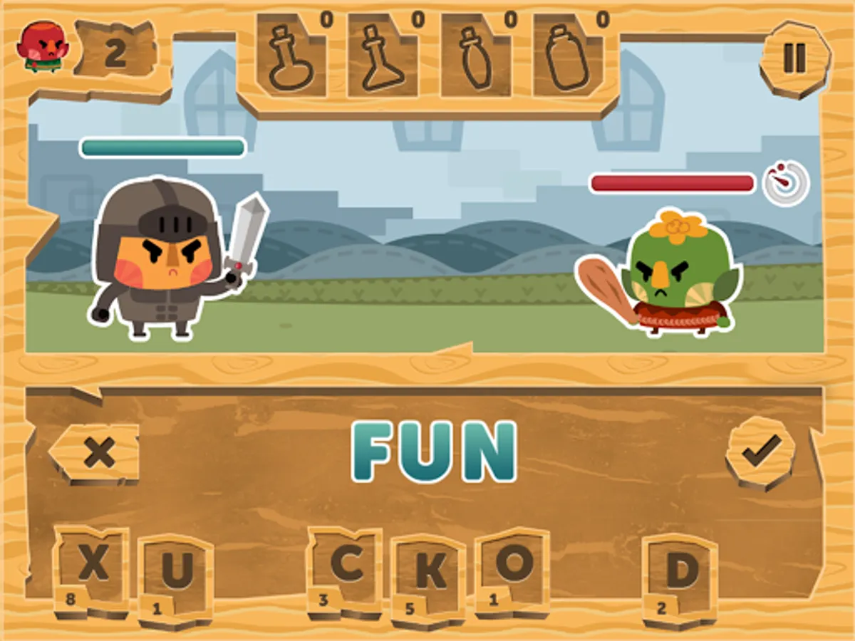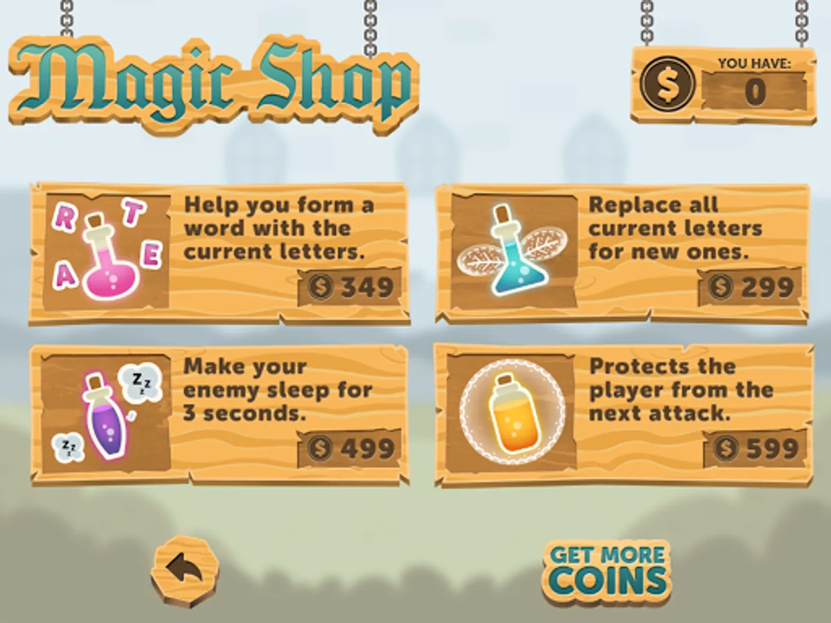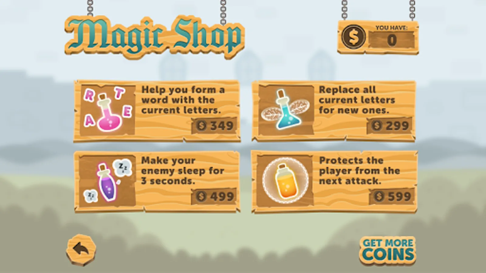 Choose the letters to spell the words that will enchant the paladin's sword. With the enchantment, he will attack the fierce goblins that have endangered the kingdom of Zell! Each word does a unique amount of damage, based on how long the word is and what letters you choose! Words have power!