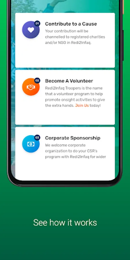 1. Contribute to a Cause; Every contribution will be channeled to registered charities and/or NGO in Redi2Infaq.