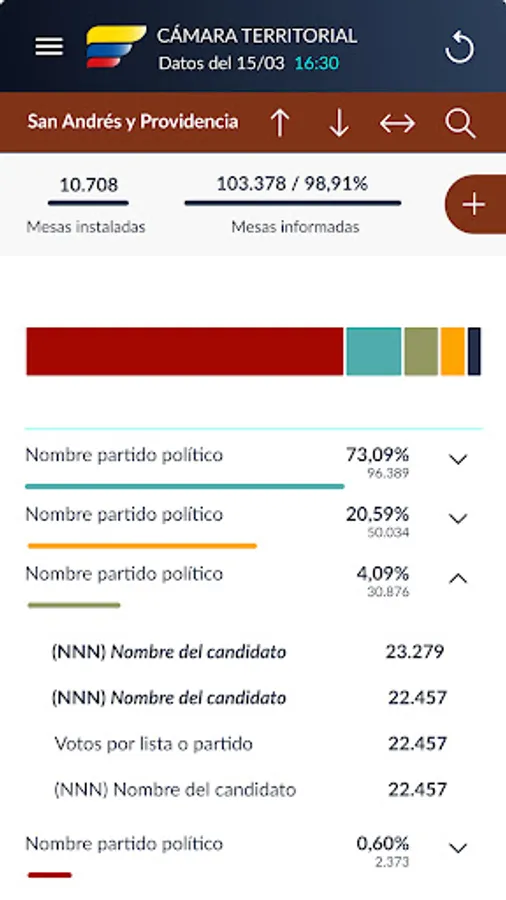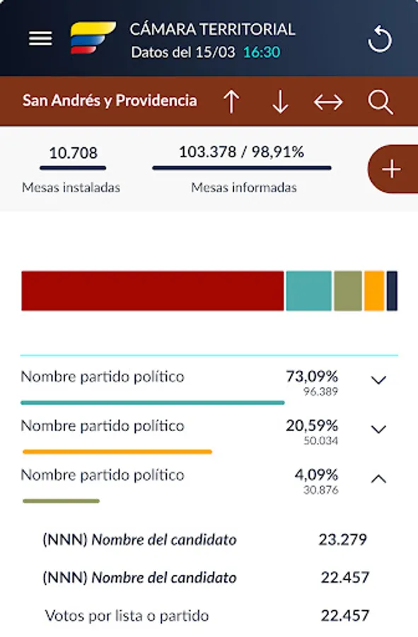 The App allows you to consult the electoral results obtained by all the lists participating in the contest, both for the Chamber constituency, as well as for the Senate, Peace Circumscriptions and the previous consultations of the 2022 presidential elections, allowing you to filter the search for results by geographical area. (department/circumscription and municipality).